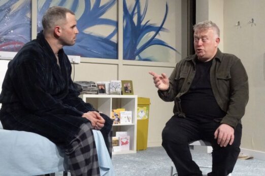 This is a play which challenges us all, but like the pieces of art which Michael creates on the walls of his hospital room, each of us will see different things mirrored back. If everyone around you suddenly said it was 11 years later than you thought, wouldn’t you initially want to believe your own mind, and view them as having some ulterior gaslighting motive? Rich Watkins’ reactions, reading the carefully curated stack of newspapers so he can catch up on the world: Brexit, Trump, Covid, Lockdown – are heartbreaking, and we feel for him, as we think back to all that’s changed since 2015. More than that, his obvious want to remember and connect with the man who says he’s been his partner for the past 10 years is so emotional, as is Mitch Jenkins responses as Paul, trying to be respectful yet desperate for his life: their life together, to have mattered. The push and pull between them is like watching a little energy dance played out on the stage.
