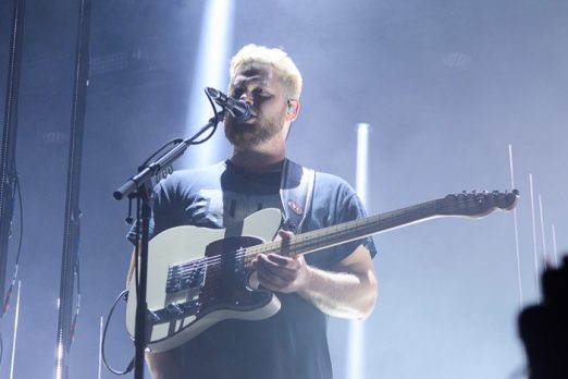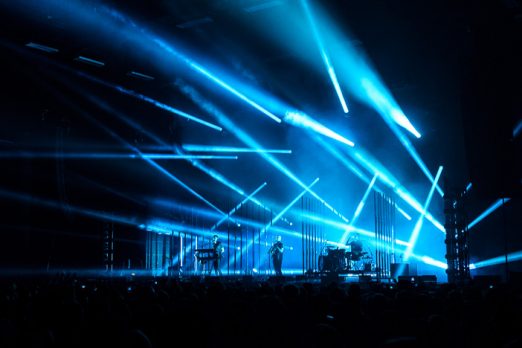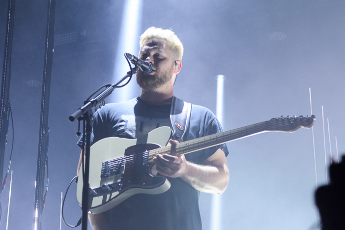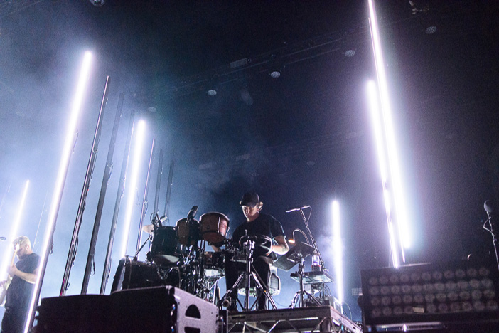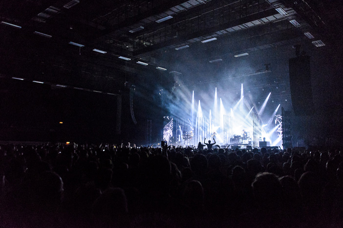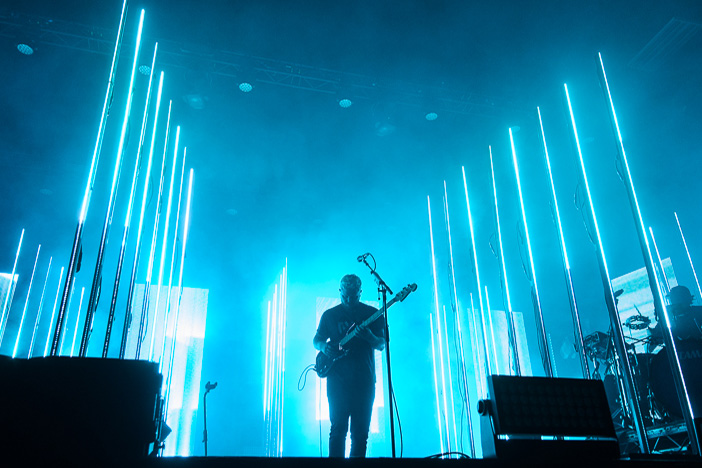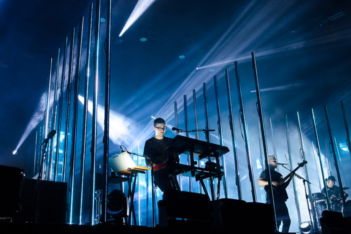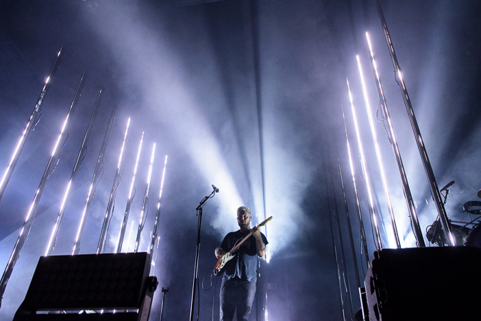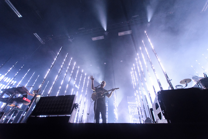 Alt-J take to the stage and find their places, every band member divided by wall of thin strip lighting and backed by light panels. It’s a gradual build with light dripping like rain and waterfalls around them, as they work up to the choral-like vocal introduction to ‘3WW’. With the crowd besotted by a slow burn atmosphere rising to a drum and strobe high, an intricate light show grows and fills the venue. Alt-J are shrouded in fog and blue light; it’s a striking start.