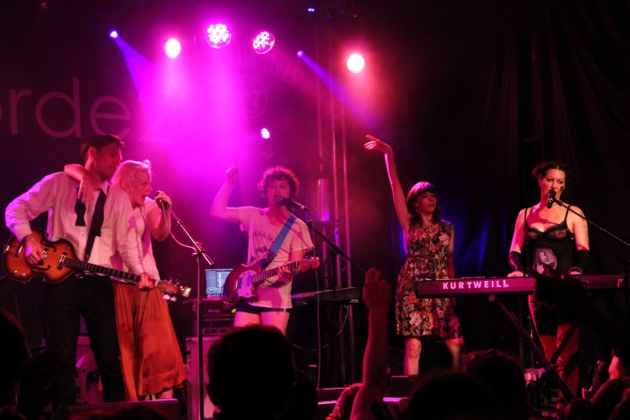 Saturday night and the Amanda Palmer party came to town. Despite the call of the beach on one of the sunniest days of the year, the packed crowd had turned out early for the support acts – most of whom were comprised of members of Palmer’s band, The Grand Theft Orchestra.