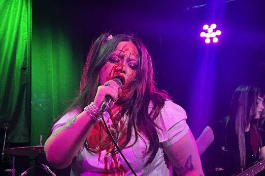 A late addition to the bill, this four-piece kicked off with a bass heavy emo beat with fans singing along from the get go. Woozy guitars lent a Cure feel with the whole band aligning to produce a powerful sound. “A love song called Love Song” edged into Grunge territory with a hint of Nirvana inspiration before an amusing and confusing entry in the group’s guest book was read out and then handed around for more comments. Homemade CDs were handed out to the lucky few at the front and, free of her guitar, Emia made the most of the stage, falling to her knees during Kids. The songs were played and sung with swagger and there was a showstopper finish as Emia poured fake blood all over face. (SC)