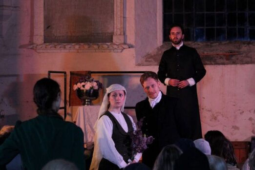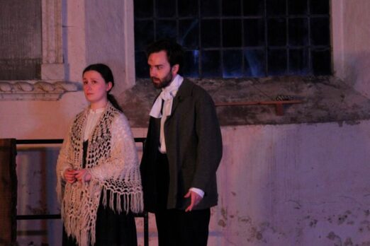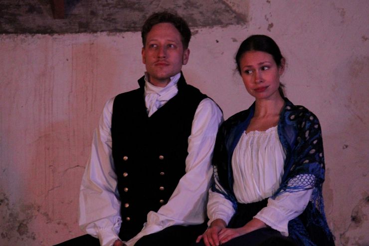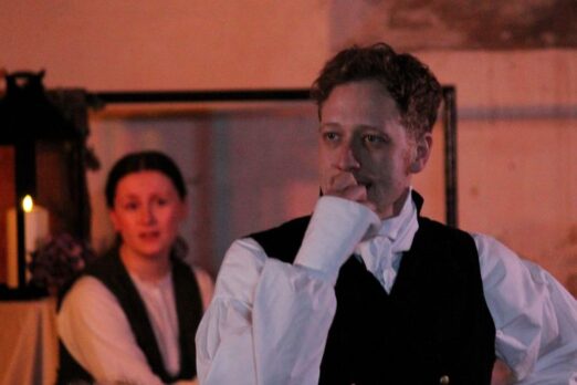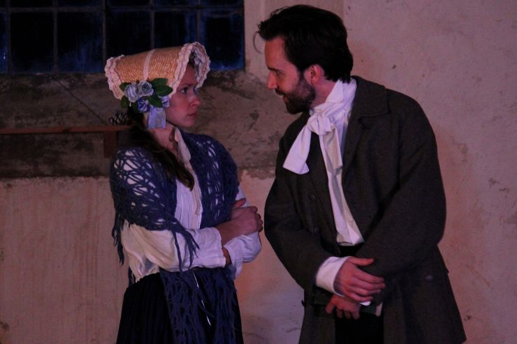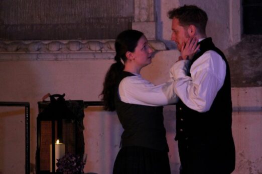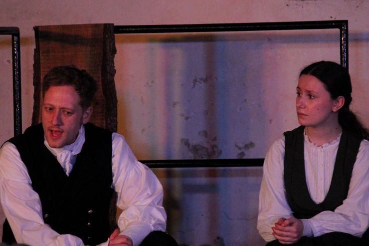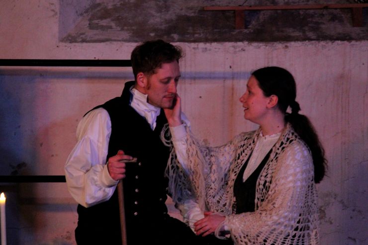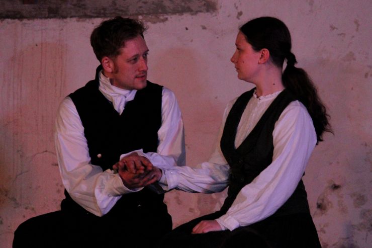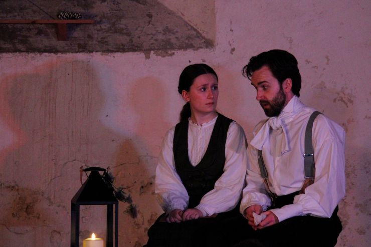 This production has given these two actors a rare opportunity to really completely become Jane and Rochester: so up close to the audience that anything less than full commitment on top of incredible acting skill would destroy our belief in them. And believe them we do. The acting skills on show here from Isobel Rathband playing the titular character paired opposite Jack Prince as Rochester is off the charts. This is some of the best acting you will see in any theatre production, so too are Niall McDaid and Lily Smith who play the multitude of other characters between them. Their versatility in changing themselves with physical aspect and voice is jaw dropping: Niall McDaid’s contrast between Mr Brocklehurst and St John Rivers are so different and distinct yet actually allow similarities and parallels to be seen between them: an insanely difficult thing to do in character portrayal, yet he made it look easy.