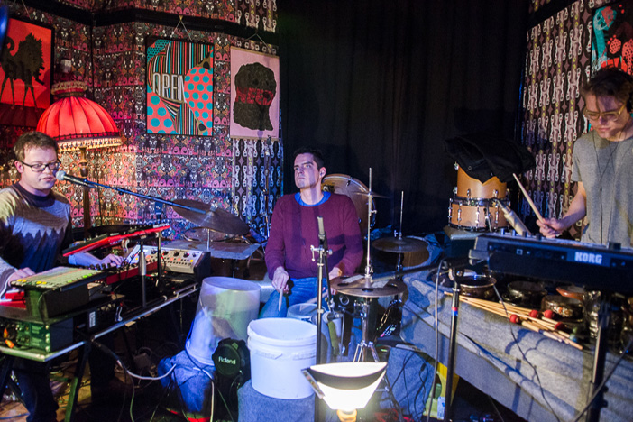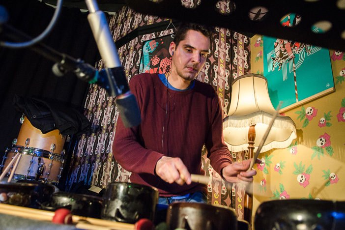 It’s intriguing just to watch Noisy Pots set up their extensive and unique kit. They use several synths and keyboards while their percussion is comprised of pots and pans, as their name implies, and a white plastic bucket. Not to do them any service, they are excellent. Otherwordly keys are punctuated by the distinctive and precise percussion and bass. With lengthy songs peaking with ethereal vocals, it’s wonderful stuff. Sadly their set is cut short as the night is overrunning by a couple of hours. (MT)